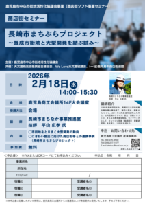 鹿児島市中心市街地活性化協議会では、中心市街地形成の中核となるハード事業(街づくり・組織形成・法整備・資金調達手法)及びソフト事業(人材育成・ブランディング・販路拡大)両面からの支援事例・実績等について、先進的な取組をしている街または専門家を招いて講演会を行っています。このセミナーでは、長崎市の大型開発の動向や、にぎわい創出に向けた商店街等との連携事例についての講演があります。